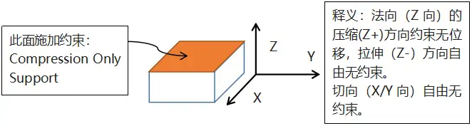 仅压缩的约束事在选定的面上的法向施加仅压缩方向的约束,而拉伸方向自由,对切向不约束。注意,无摩擦约束是在选定面的法向施加拉伸和压缩的约束,而仅压缩的约束是在选定面的法向施加压缩方向的约束,所以无摩擦约束是线性约束,而仅压缩的约束是非线性约束,会增加计算时间。