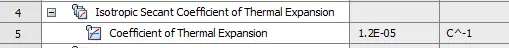 检查是否已定义了热膨胀参数,下图为程序默认的结构钢定义的热膨胀参数,已定义了各向同性热膨胀割线系数Isotropic Secant Coefficient of Thermal Expansion,热膨胀系数Coefficient of Thermal Expansion为1.2×10^-5mm/℃。