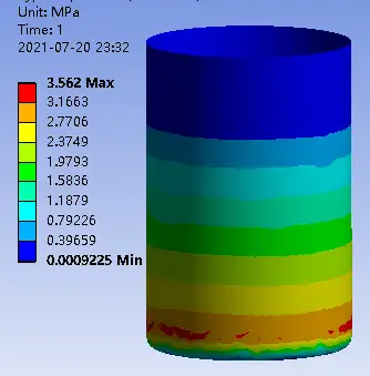 加载时注意Magnitude的方向应该竖直向上。施加静水压力时,需要选择所有粮仓内表面,设置完成后会在粮仓内表面生成压力示意图,颜色越红表示压力越大,越蓝表示压力越小,液面以上部分(Y>2500)颜色均为深蓝色,表示压力为0。