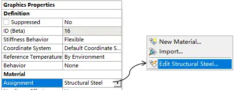 进入Mechanical,在特征的Model下点击几何体,如下图点击Edit Structural Steel进入材料库。