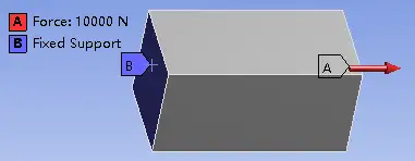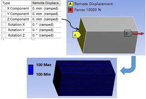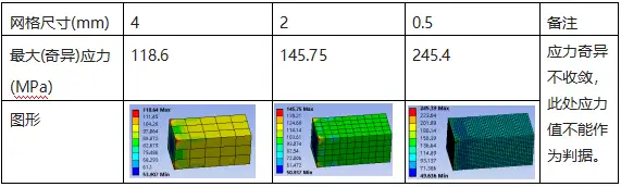 需要注意的是在固定约束处会产生应力奇异,所以不能以固定约束处的应力作为结果判据。下面以截面为10mm×10mm的矩形条拉伸说明此问题,固定矩形条一端,另一端施加10000N的拉力,根据材料力学的理论。矩形条的应力应该为σ =F/A=10000/100=100MPa。使用固定约束后,在不同网格尺寸下的最大(奇异)应力见下表,最大(奇异)应力均出现在固定约束处。