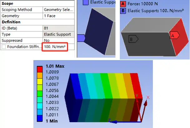 输入边界条件验证如下,结果显示弹性约束面朝压缩方向位移为1mm。