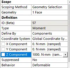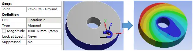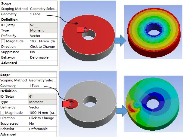 力矩可加载在点、线、面上,施加在面上的力矩,力矩的旋转中心为所选面的几何形心。如下例,固定内孔,将力矩分别加载在不同位置,所计算的变形结果反应了力矩旋转中心。