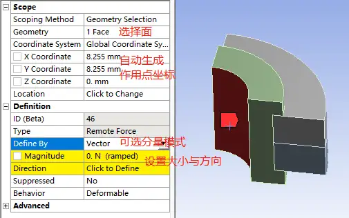 远端力是指在点、边、面上施加一个远离集中力的载荷,相当于施加力一个集中力和一个力矩。在细节窗口中需要指定力作用点和大小。