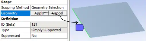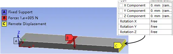 第二步:Remote Displacement,在同一端选定同样两条边,限制所有自由度;