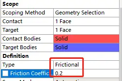 回到Mechanical中,修改接触关系,点击特征树的Connections——Contacts下的接触对,将接触类型Type的绑定Bonded改为摩擦Frictional,摩擦系数设置为0.2。