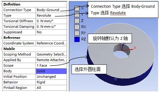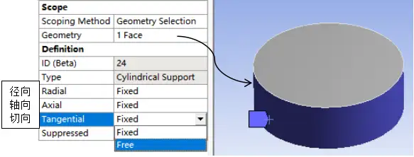 圆柱面约束是指在圆柱表面施加轴向、径向、切向(圆周方向)约束,默认三个方向都为固定,可以通过下拉菜单选择自由,该约束仅适用于小变形的线性分析。