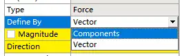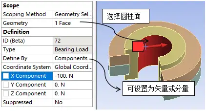 载荷与约束施加方法有两种:矢量Vector或分量Components。矢量只需给定载荷大小与某一方向,分量需给定某一坐标轴的XYZ三个方向的数值,可以是默认全局坐标,也可以是用户建立的坐标。