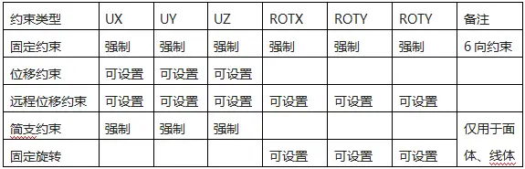 对于实体,存在X/Y/Z三个方向的移动共3个自由度,对于面体和线条,存在X/Y/Z方向的移动及绕X/Y/Z的转动共6个自由度。下表总结了部分约束所限制的自由度数量