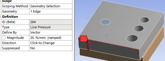 线压力以载荷密度的形式在边上施加一个均布载荷,单位为N/mm,方向可以按矢量、分量和切向方式。