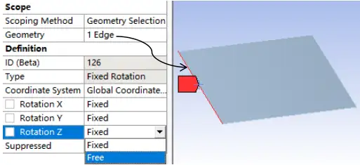 固定旋转只适用于线体或面体(即梁或壳单元),只能加载在的边线或顶点上,固定旋转约束三向旋转,不约束位移自由度。每一方向的旋转自由度可通过下拉菜单修改为free(自由)。
