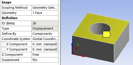 约束点、线、面的位移自由度,即约束实体、面体、线体X/Y/Z方向的移动,默认是全局坐标系,可以在Define By中设置自定义的坐标系,在各向X/Y/Z Componernt设置X/Y/Z向强制位移的值,默认为Free(自由),设置为0时表示此方向约束,输入具体数值时表示在此方向强制移动此距离。