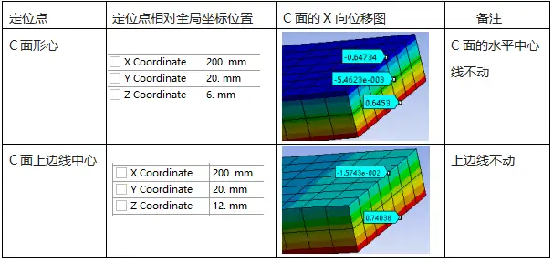 从上例也可以看出,虽然给C面施加了XYZ三向移动约束,未施加转动约束度,C面发生了围绕定位点的转动运动(相当于铰支点),这是固定约束与三向位移约束无法实现的效果。