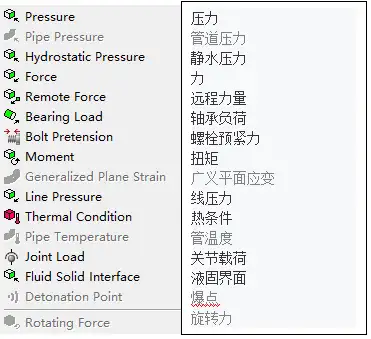 Mechanical中有4种类型的边界条件:惯性载荷、结构载荷、结构约束、热载荷。