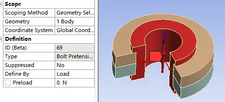 螺栓预紧力可加载在圆轴面、单个体或多个体上,用于模拟螺栓连接。如果加载在一个体上,需要指定一个坐标系,预紧力作用在该坐标系的原点,且方向沿Z轴收缩。