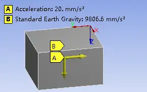 - 加速度Acceleration:加速度作用于整个模型上,加速度方向可通过矢量Vector施加,或通过分量Components分别设置XYZ三向加速度。加速度经常用于计算过载,注意由于加速度施加在系统上,惯性将阻碍系统的速度变化,因此惯性力的方向与加速度大小相等,方向相反。